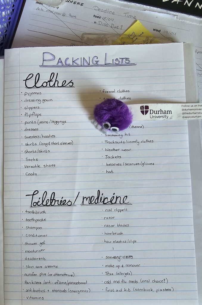 I hope this blog post has been helpful, and good luck with your travels to Durham, and your degree overall! If you have more questions about anything like this, or Durham in general, you can reach out to myself and other university ambassadors on Unibuddy. I’ve also included my own packing lists as a reference if you need some help starting, but again remember to adjust them as you need!